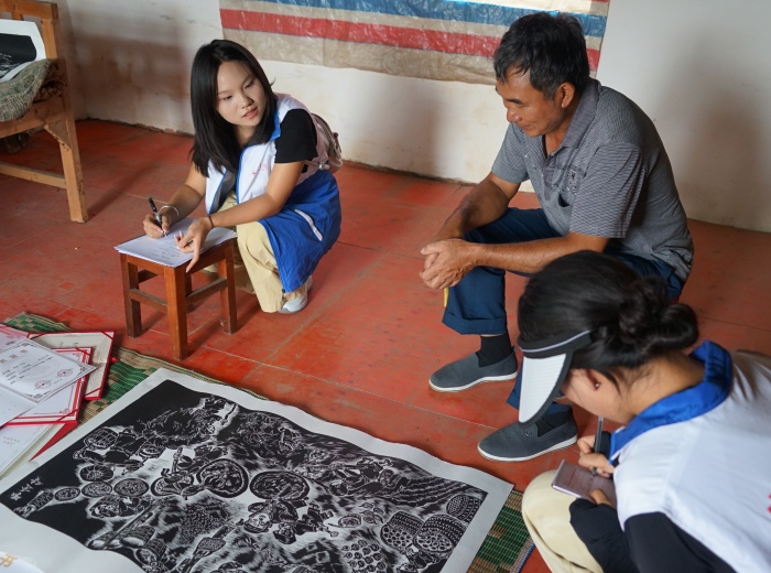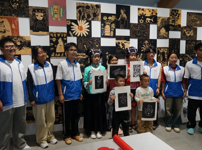 美术与设计学院院长孙华、党委副书记朱琳于2024年暑期带领30名师生深入马关县阿峨新寨,聚焦农民版画的保护与传承开展调研。实践团通过系统调研、专业赋能与创新实践,完成三项核心成果:一是学习非遗技艺并完成210余平米版画展厅规划及110页版画发展画册设计;二是以“传统+创新”模式,创作20余幅创意版画及50余件文创产品,推动非遗活化;三是在阿峨新寨建立“美育工作站”,每年开展2次留守儿童美术教育,为乡村振兴注入美育力量。调研期间,团队累计收集整理100余幅版画作品信息,通过一对一入户调研挖掘非物质文化遗产内涵,并联合当地传承人探索版画产业化路径。学生将专业实践与社会服务结合,既掌握了传统技艺精髓,又为阿峨版画可持续发展提供新思路。