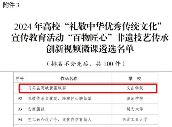 近日,教育部办公厅公布了2024年高校“礼敬中华优秀传统文化”宣传教育活动结果,文山学院报送作品《马关县阿峨新寨版画》入选“‘百物匠心’非遗技艺传承创新视频微课遴选名单”,全国共遴选作品100件,云南省仅4件入选。