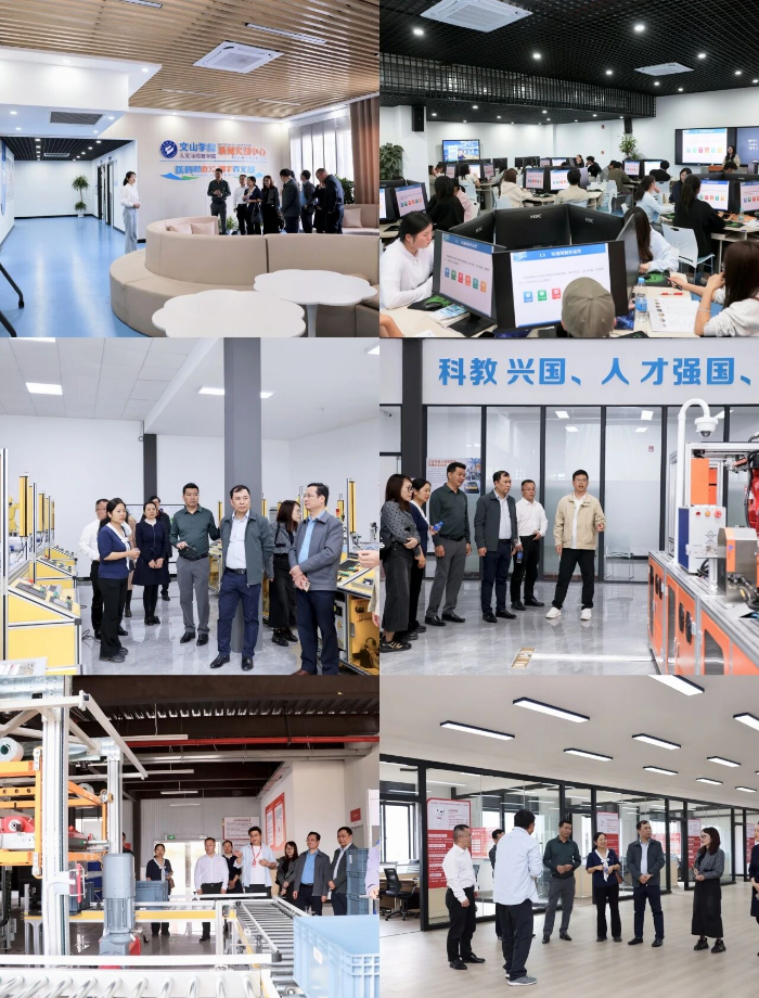 在文山学院副校长汤龙陪同下,代表团先后走访文山学院图书馆、新闻实训中心、智能制造实训中心、京东实训中心、传习馆及学生食堂、宿舍,实地考察办学条件、专业实训平台与学生生活保障设施,全面了解学校办学特色与建设发展成果。在各教学实训场所,代表团现场体验智慧图书馆服务、传媒实训、智能制造、电商直播、智慧物流等教学场景,对学校智慧化建设、产教融合、校企合作等育人成效给予高度评价。
