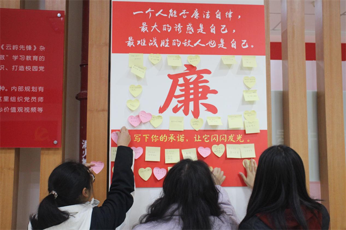 诵读余音未落,学生们移步至早已准备好的“廉”字互动墙前,纷纷拿起笔在彩色便签上郑重写下承诺——“清白做人,踏实做事”“守得住底线,看得见远方”……贴纸上写下的承诺,是一份对自我的庄严契约。