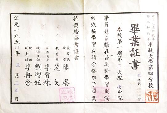 1950年5月25日颁发的二野军政大学四分校杨家骥毕业证书