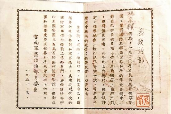 1951年3月,云南军区政治部发抗美援朝战斗中表现突出的二野军政大学四分校杨家骥记三等功证书