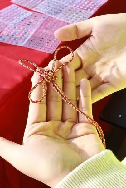 在“红色记忆转盘”环节,学生转动轮盘随机抽取演唱红色歌曲或讲述历史故事,在互动中回顾红色经典、感受革命精神。中国结编织体验区,志愿者向参与活动的学生传授中国结编织技巧,一根根红绳在指尖穿梭,交织成对祖国的深情祝福。学生在动手实践中真切感受到中华传统文化的魅力与温度。现场,一张巨幅中国地图逐渐被五彩的祝福便笺纸点缀。“愿祖国繁荣昌盛”“青春奋进正当时”等真挚留言,汇聚成生动的“祝福山河图”。一张张便签承载了青春的誓言,每一句祝福都蕴含着赤子之心。在“我在云南工商学院向祖国表白”打卡区前,同学们手持主题牌留下珍贵影像,并通过社交平台传递爱国情怀。