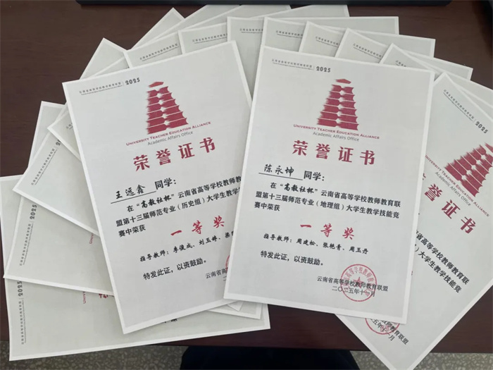 现场公布了“高教社杯”第十三届师范专业大学生教学技能竞赛结果,文山学院收获颇丰:2项一等奖、5项二等奖、8项三等奖,同时学校荣获优秀组织奖。本次竞赛中,文山学院学生在各学科组别表现亮眼,其中陈永坤同学斩获地理组一等奖(指导教师:周建松、张艳青、周玉丹),王远鑫同学斩获历史组一等奖(指导教师:李俊成、刘玉婷、梁国贤),充分展现了文山学院师范专业人才培养的扎实成效。