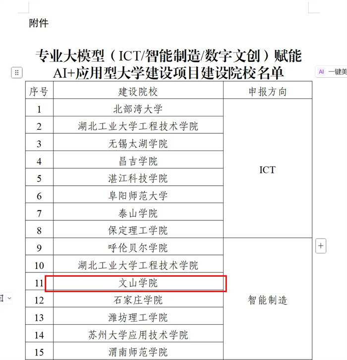 近日,教育部学校规划建设发展中心正式公布《专业大模型(ICT/智能制造/数字文创)赋能AI+应用型大学建设项目建设院校名单》,文山学院从全国众多高校中脱颖而出,成功入选。这是文山学院长期深耕应用型人才培养的成果见证,更是学校在智能制造领域战略布局的关键突破。
