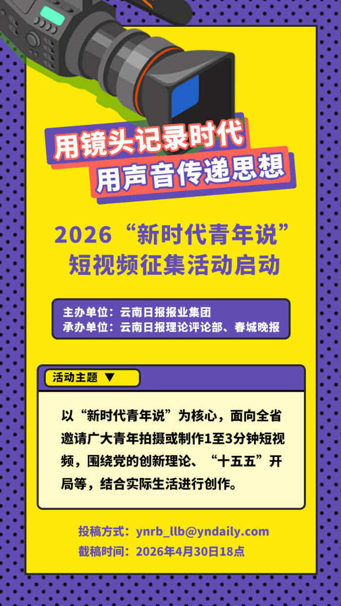 为深入学习宣传贯彻党的二十届四中全会精神,加强对“十五五”时期重大理论和实践问题研究,深化党的创新理论体系化学理化研究阐释,即日起,云南日报报业集团联合在滇高校等单位,正式启动2026“新时代青年说”短视频征集活动,号召全省广大青年学生用镜头记录时代,用声音传递思想,抒发对国家发展、社会进步、个人成长的深刻思考与责任担当。