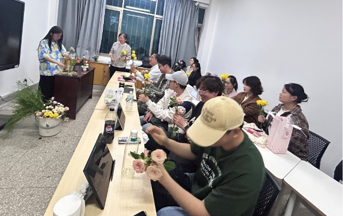 活动中,黄忻瑶现场演示中式插花技法,指导同学们学习手打螺旋技法,将“取俯仰高下,疏密斜正”的典籍论述转化为动手体验。读书会指导教师曹茂教授在总结中鼓励同学们珍惜银龄教授资源,以师者为范,虚心求教。