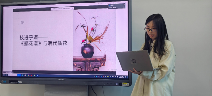 2025级科技史硕士生黄忻瑶围绕明代张谦德所著《瓶花谱》作主题汇报。她从中国插花历史脉络入手,系统梳理了该书“品瓶、品花、折枝、插贮、滋养、事宜、花忌、护瓶”八节构成的技术体系,指出该书与袁宏道《瓶史》并称明代插花理论双璧,并介绍了“九品九命”花材品评方式及中西方插花审美差异。